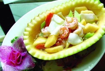 (2)锅中倒入鸡汤,放入哈密瓜叶块,煮至熟透。